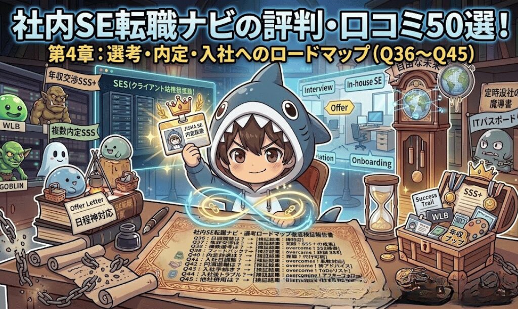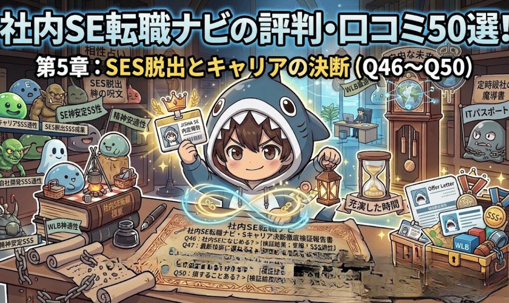 だからこそ、私は「社内SEへの転職」という最強のクエストを推奨しています。 今回は、自社開発・社内勤務への切符となる『社内SE転職ナビ』について、読者から寄せられるリアルな疑問・不安50個に、現役PMの視点から一切の忖度なしで回答します。