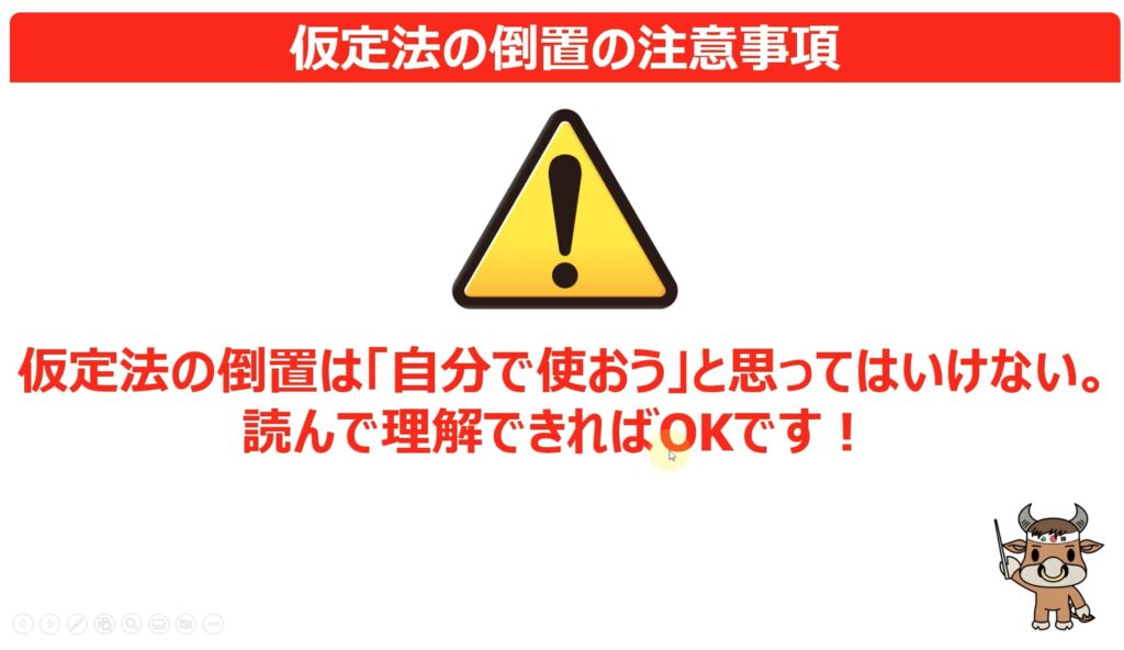 動画内で強調されている通り、今回解説された「仮定法の倒置」という高度な構文技術は、読み手として理解できれば十分であり、自らの発話(スピーキング)で能動的に使用しようとするべきではありません。